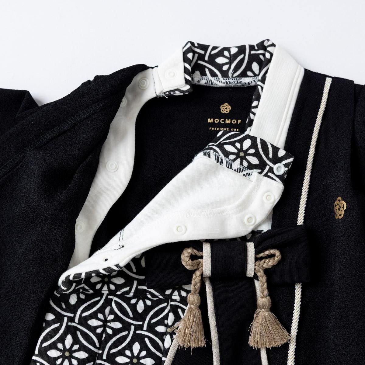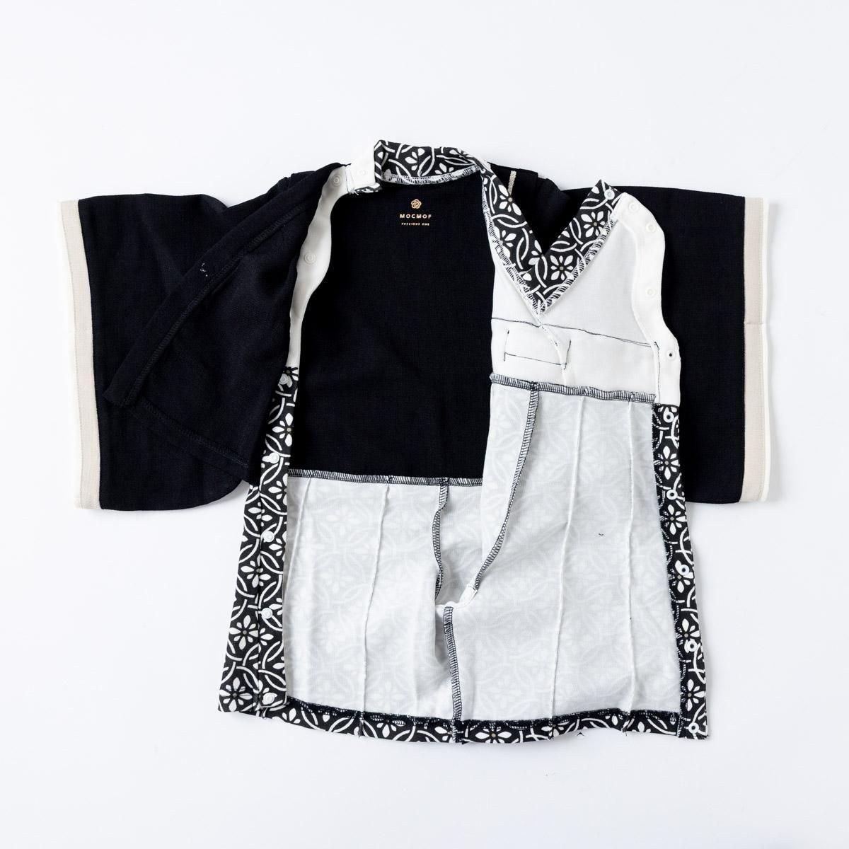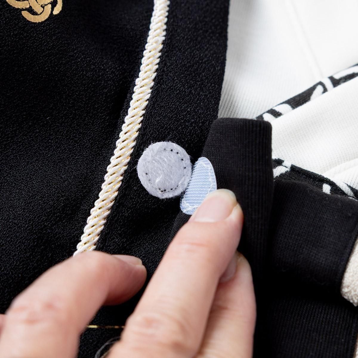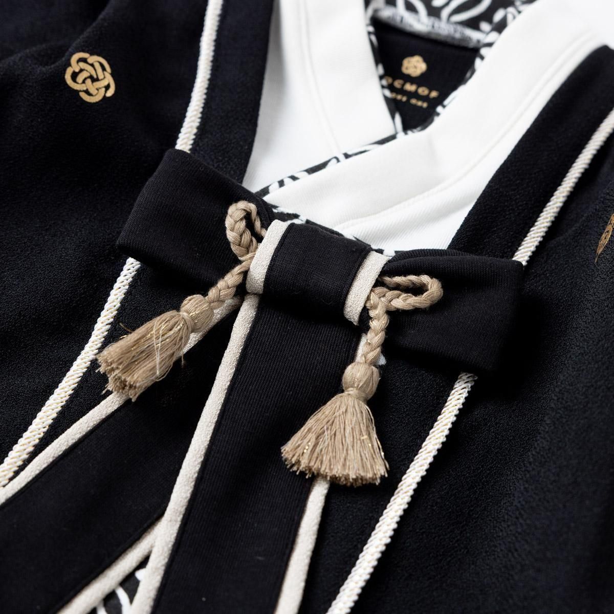 脇のスナップボタンで上から下まで全開できる一体型でありながら、羽織を重ね着しているようなレイヤーデザインや紋のワンポイント、タッセル風の紐などで立体的に仕立てました。
