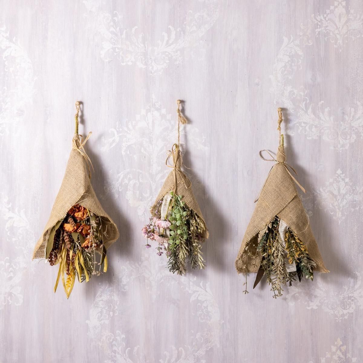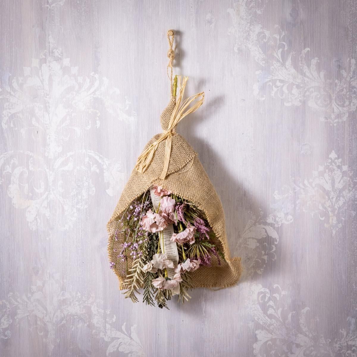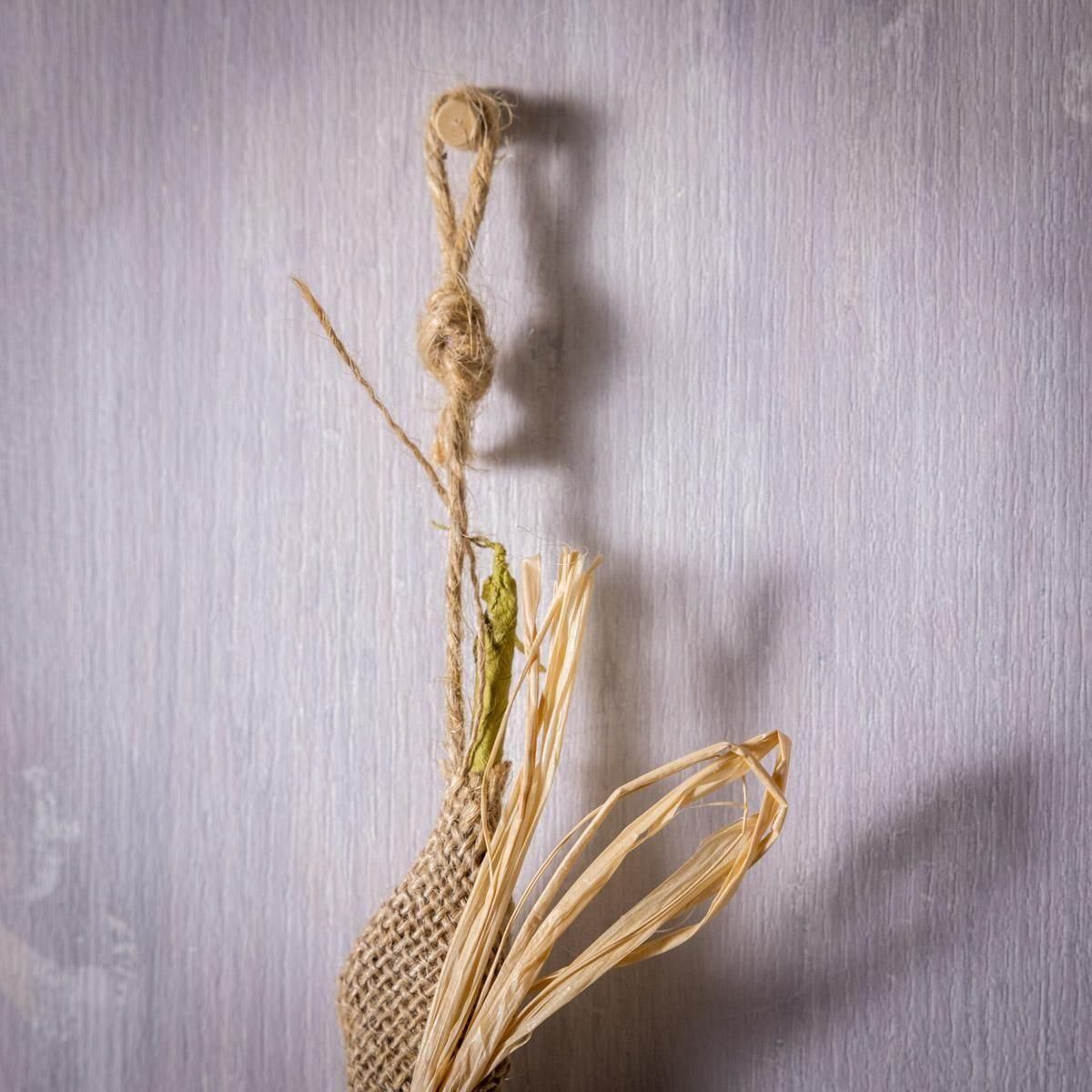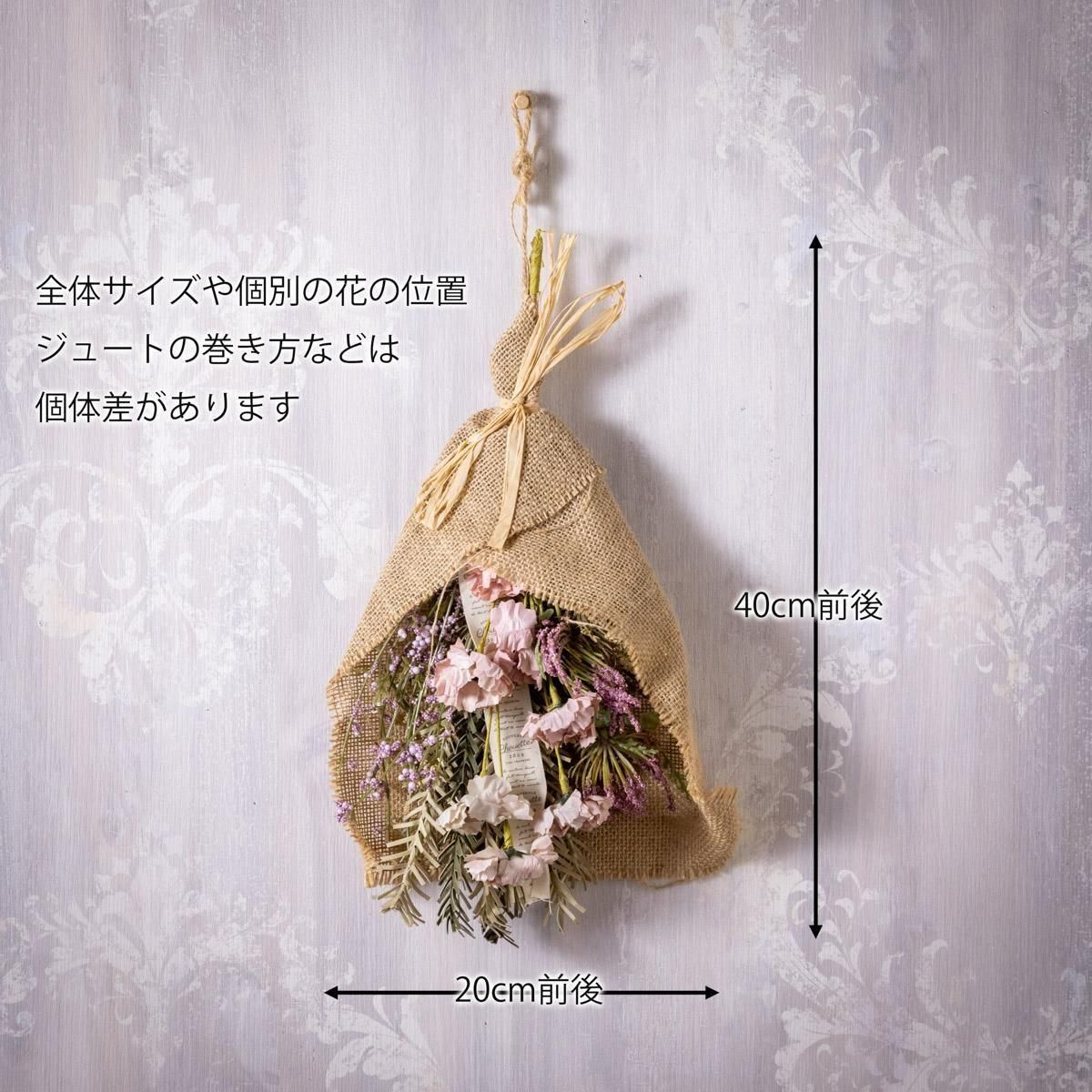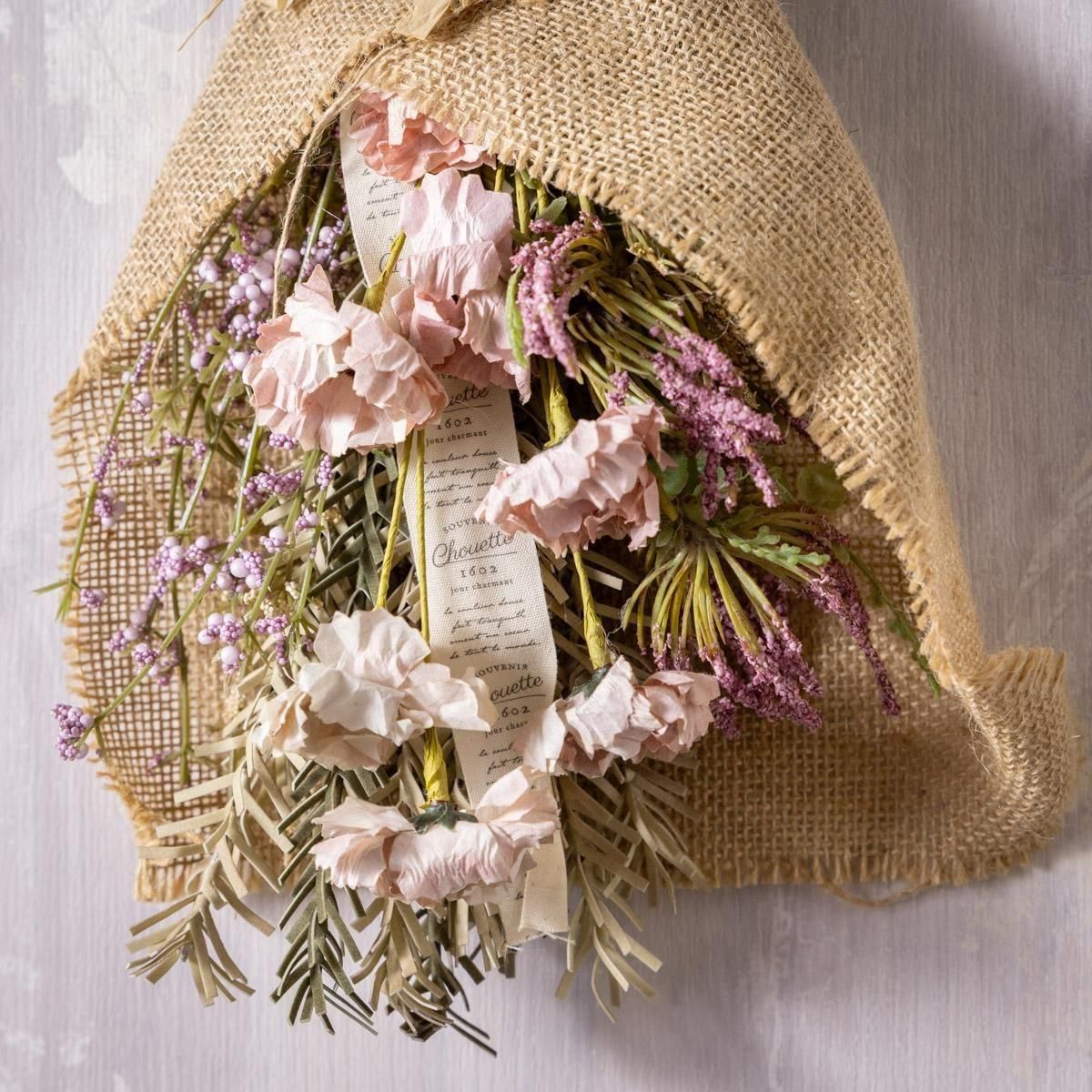 造花パーツを厳選し、ジュート生地で巻いて仕上げました。