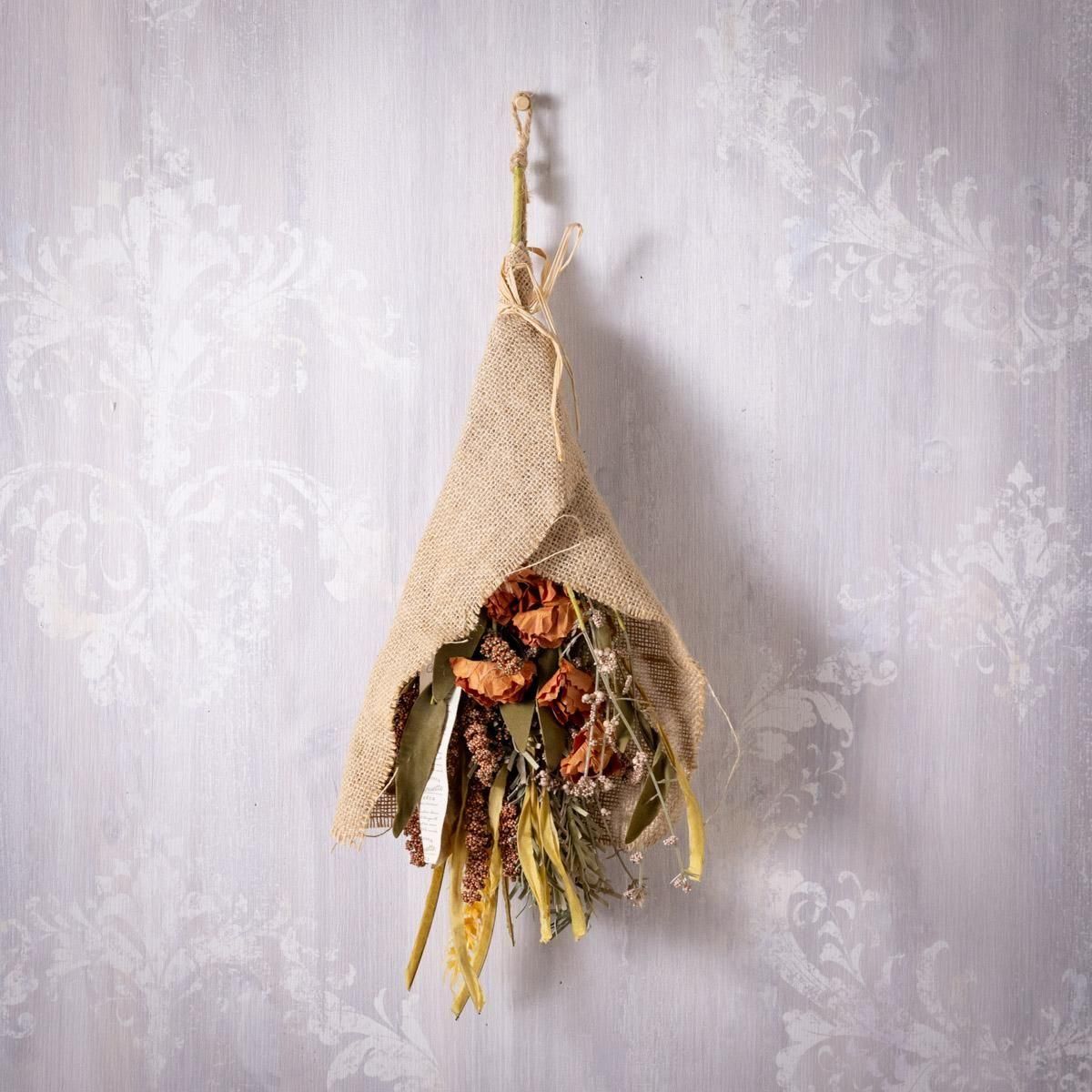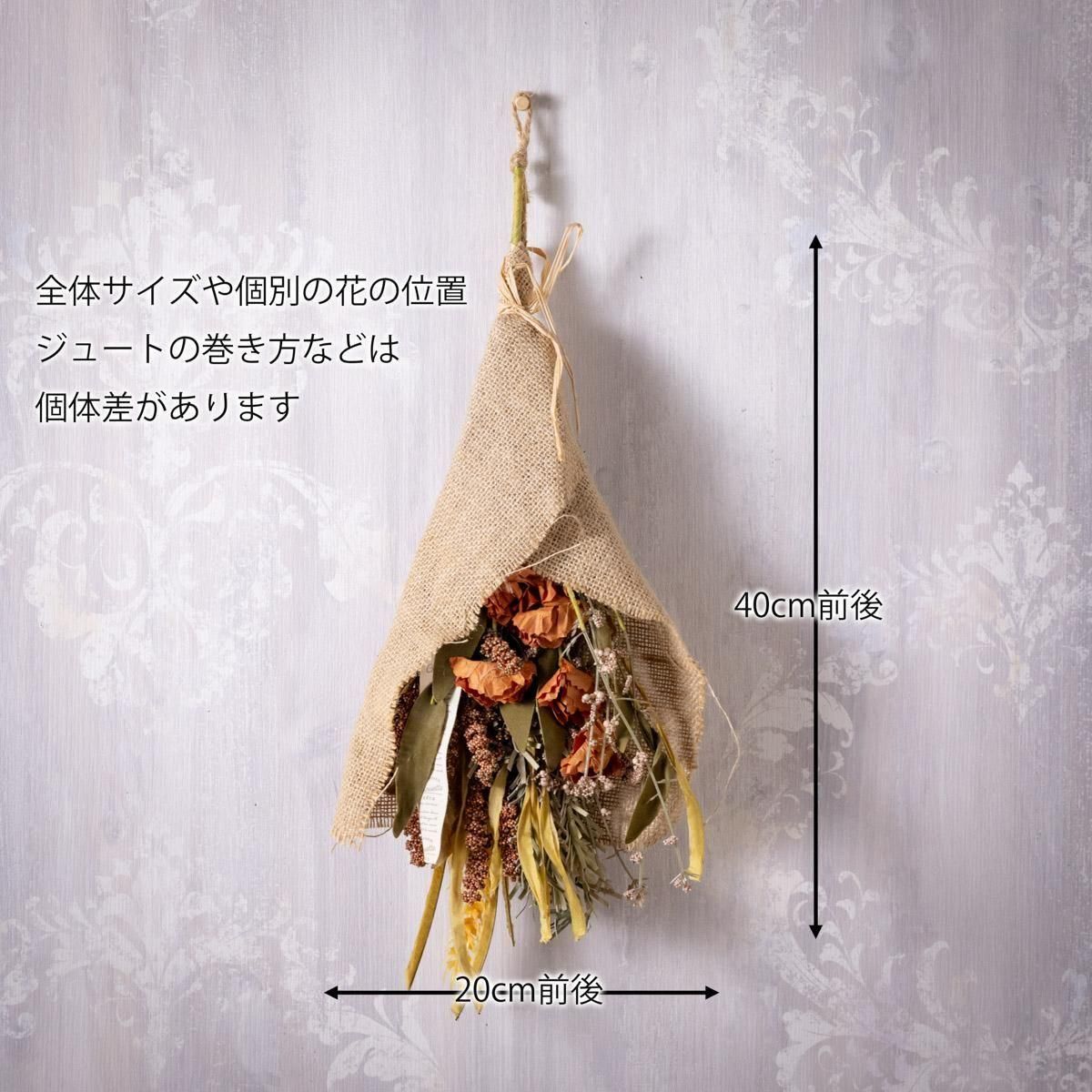 造花パーツを厳選し、ジュート生地で巻いて仕上げました。